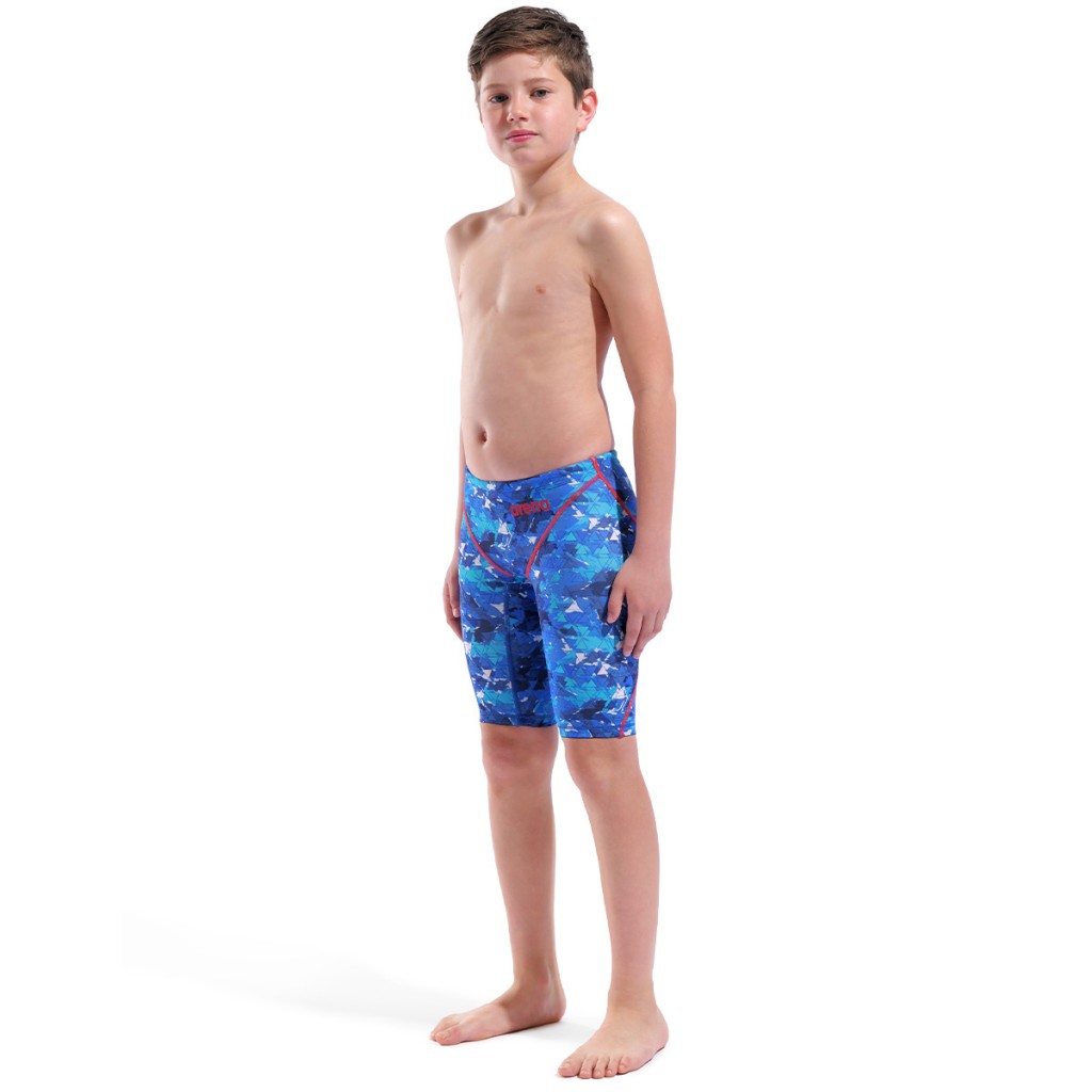 Introducing the arena Splashy Multicolor Limited Edition Powerskin ST Next – the first-ever FINA-approved racing jammer made with recycled fabrics, designed for eco-conscious performance. This boy's tech suit is lighter, faster, and built for lasting compression and enhanced durability. Its low-profile seams ensure a perfect fit and unrestricted movement. The calming blue and white design with dynamic triangle patterns inspires balance, confidence, and focus. Ideal for new competitive swimmers, this limited edition suit blends style, sustainability, and performance in one powerful package.