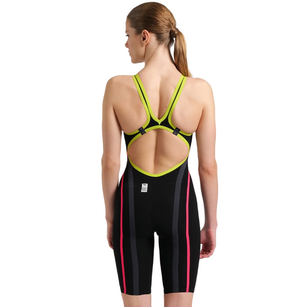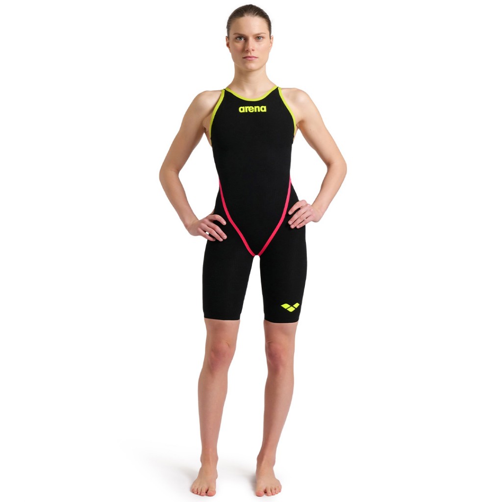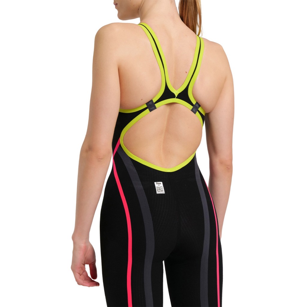 With a highly compressive fabric, twin back taping with a lifting effect in the water and an upper body design that ensures flexibility, our women's Limited Edition Black Open Back Powerskin Carbon Core FX is the ultimate tech suit for powerful swimming. It is made with two layers of our carbon fiber technology with a compressive band lining and carbon grid shell that surrounds the body, creating a locked-in feeling. The fluo yellow taping adds a high-contrast look to this FINA-approved suit.