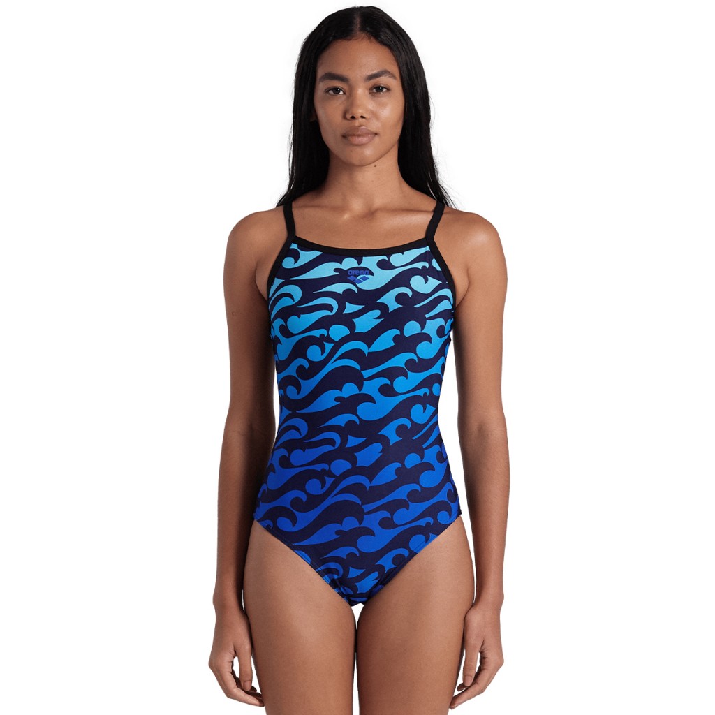 Embrace the sea's spirit with arena's Surfs Up Light Drop Back Swimsuit for women. Ideal for both competitive and casual swimmers, it's made from highly chlorine-resistant MaxLife Eco fabric with UPF 50+ UV protection. With at least 50% recycled polyester, it's eco-friendly, and the production process saves energy and reduces CO2 emissions. Its thin straps and ergonomic back offer a secure fit, while front lining adds comfort. OEKO-TEX® STANDARD 100 certified, it's safe for you and the environment. Dive into style and sustainability with arena's Surfs Up Swimsuit!